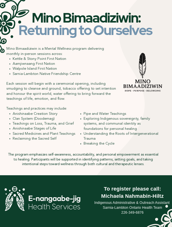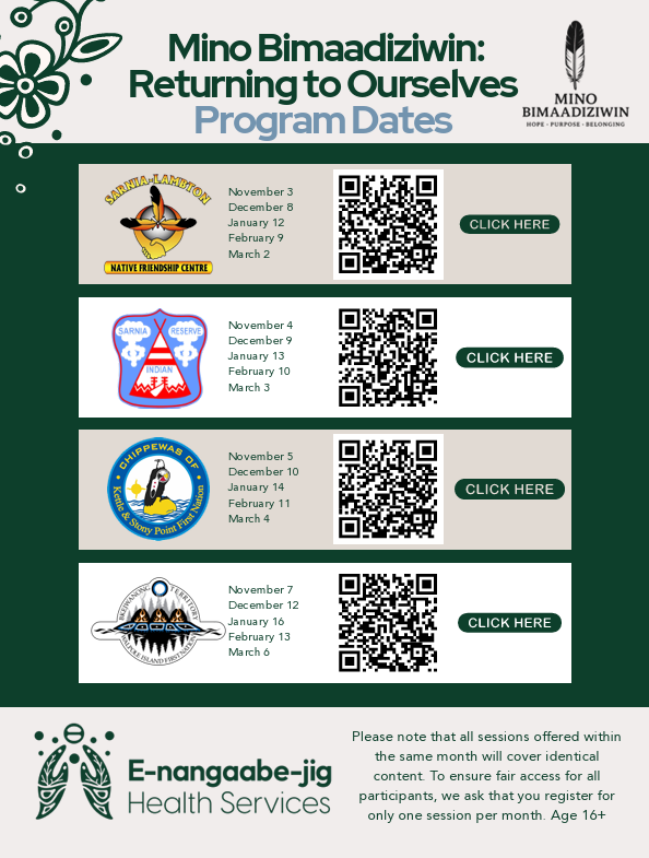 Mino Bimaadiziwin: Returning to ourselves programming (General poster) The 3rd session is now open for registration. These sessions will continue monthly until March. Community specific posters below.